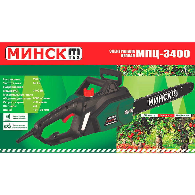 Ланцюгова електропила Мінськ МПЦ-3400 створена на основі двигуна, що має споживану потужність 3400 Вт і бічне розташування. Призначена для помірного використання в побутових умовах.