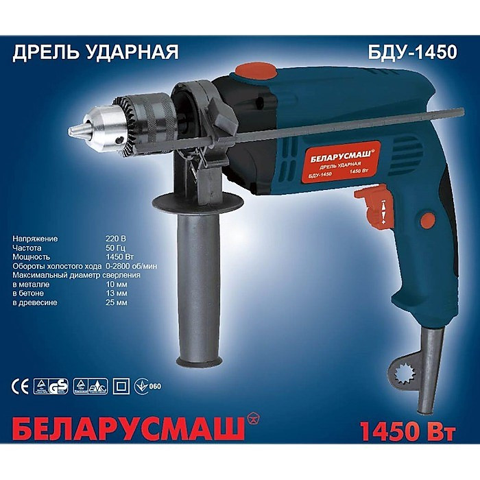 Дриль ударний Беларусмаш БДУ-1450 володіє надійним електродвигуном і створена на основі якоря потужність якого становить 1450 Вт, який дозволяє набирати 2800 об/хв. Представлений дриль оснащений металевим патроном (під ключ) який міцно фіксує оснастку, так само встановлений надійний закритий металевий підшипник і зносостійкий шестірні редуктора.